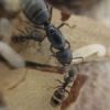 Yesterday I moved the last two ants I have of this sp. (1 queen, 1 major) into a nucleus because the test tube was running low on water, and the plastic box I had them in was getting really filthy. I fed them in the new nest and they've been eating really well (the major transferring food to the queen, she doesn't feed herself, but she is eating) but they haven't found their way into the nest yet, just hanging out in the outworld. They seem to be doing ok.