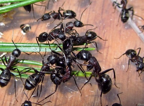 Most of Polyrhachis queens finished 'pheromone copying', but some Polyrhachis queens are sticking to Camponotus queen's cadaver to copy Camponotus queen's pheromone.