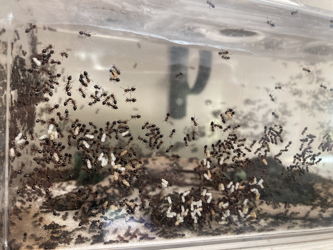 These ants have really enjoyed the growing spring warmth and the generous feedings I’ve offered them during my spring break. Most of the queen pupae has eclosed by this point, and I can see lots of winged queens hanging out in the lower chambers of their nest. A new food I’ve been giving them is frozen bloodworms, and they’ve been a big hit. I didn’t make the bloodworm soup like Nurbs does since the last time I tried some ants got stuck in it. Instead, I’ve strained it a bit and put damp clumps in a little feeding dish. Yum.