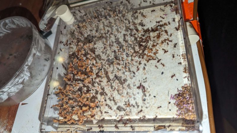 In the just under two months since my last update, this colony has grown a lot. They're easily in the several hundreds, maybe even low thousands now. They've gone from filling one test tube to filling a decent portion of a THA inception chamber, even with a chunk of the colony hanging out in the backup water tube.
