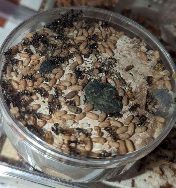 The morrisii were doing great until they weren't; another queen fallen victim to sudden Eat [censored] and Die syndrome. The dentata are doing great, they already have a large brood pile and several majors, it feels like they're growing at a significantly faster rate than the bicarinata were at their size. I also just got a small P. pilifera colony. Only around four workers so far, but I'm very excited for them to grow out. The bicarinata are also doing very well. I just moved them into a natural formisquarium, which they look great in. I've been debating back and forth about attempting to grow these guys out to a mature size, since they're one of the few species I have which would be feasible to do so, and I think I've decided to go for it. It should be doable, and a nice last antkeeping achievement to get in this last year before college.
