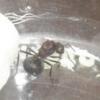 The food was physically unchanged for several days, and either the ants or springtails chewed off a piece that was separated from the bulk of it. After a few days, very large, translucent-colored mites appeared on the food. Shortly after this, a red film began covering the food, and quickly covered it entirely.