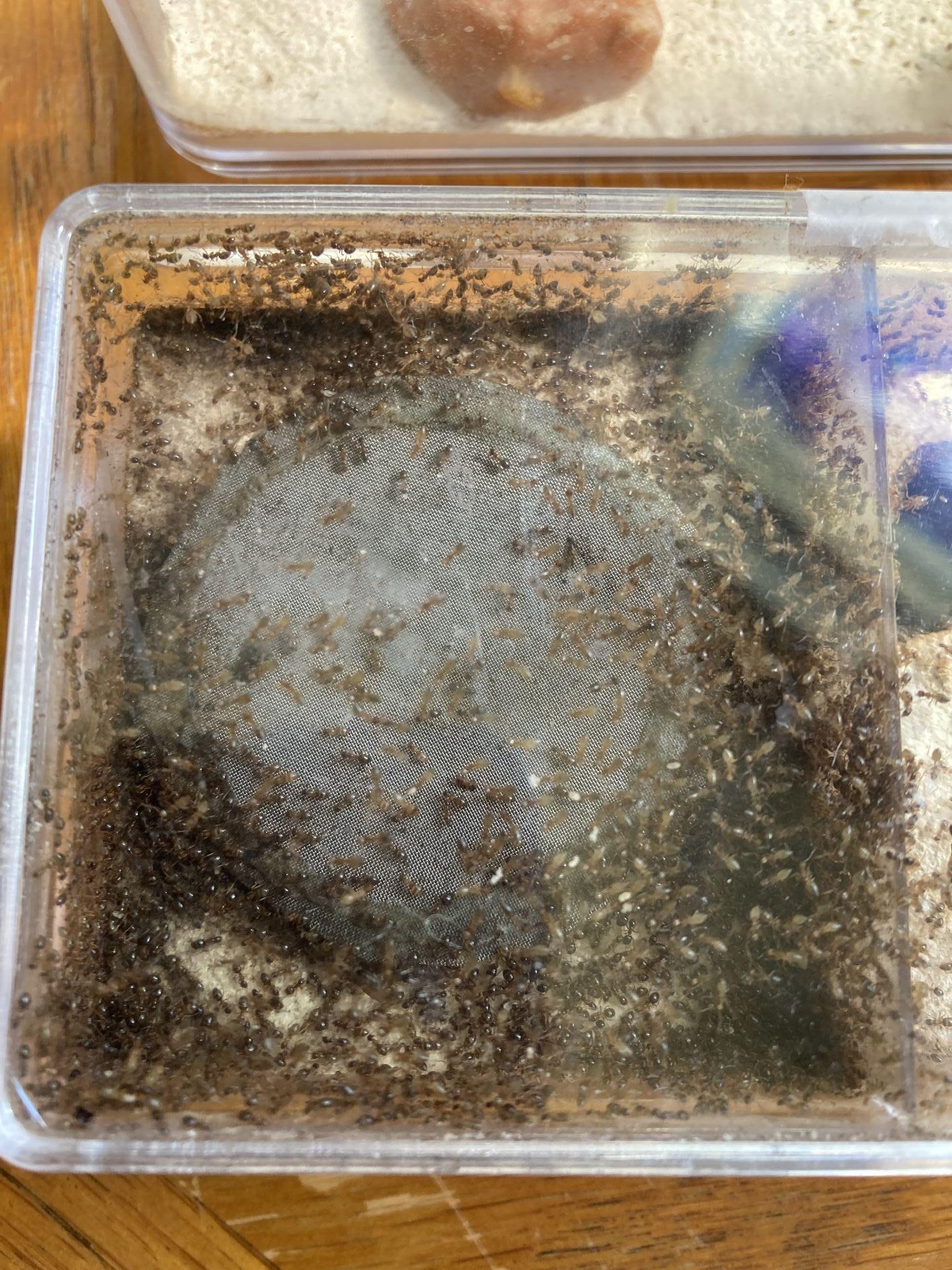 My large colony of Nylanderia vividula are starting off their third season. I brought the colony home from my parents' cold basement on Saturday to start their spring despite the fact that it was snowing outside. I'm letting them warm up slowly at room temps, but I'll start to heat them today. The colony culled all the male alates that remained, but there are still several queens alates in the nest. It's tricky now because several of them have pulled off some of their wings, so it is almost impossible for me to tell which one is the OG queen. I think there may be several productive queens in the nest now after I let some mate on my blacklight sheet last summer and returned them to the colony. Despite their small size, I can't sing the praises of Nylanderia enough.