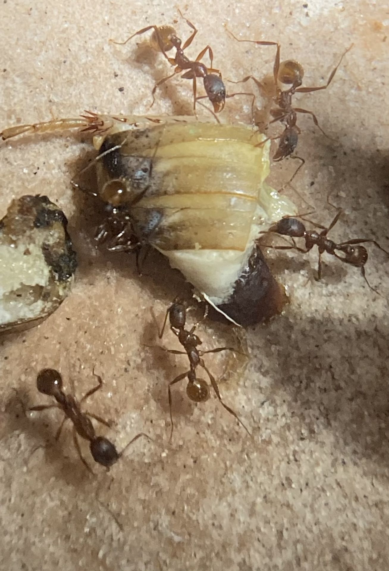 These treatae are quickly becoming one of my favorite colonies. They are growing very fast now and are probably near or even over 100 workers. I'll definitely need to upgrade their nest space soon, but I've been so busy that it's hard to find the time to work on the DIY project I have in mind. Hopefully I'll have more time for these sorts of things once I finish teaching for the year. Here is a photo of foragers gathering up tasty mealworm segments.