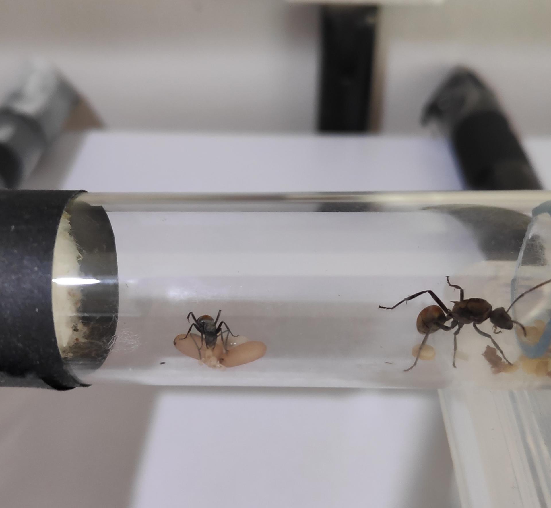 One of my Polyrhachis Ammon queens got her first worker today! Its so cute and staying over the brood.
