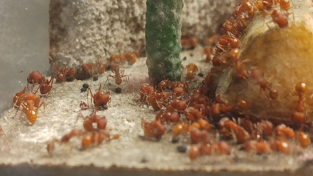 And then a whole bunch of other ants will gather around in the main chamber, all in the same hunched over seed cracking position.