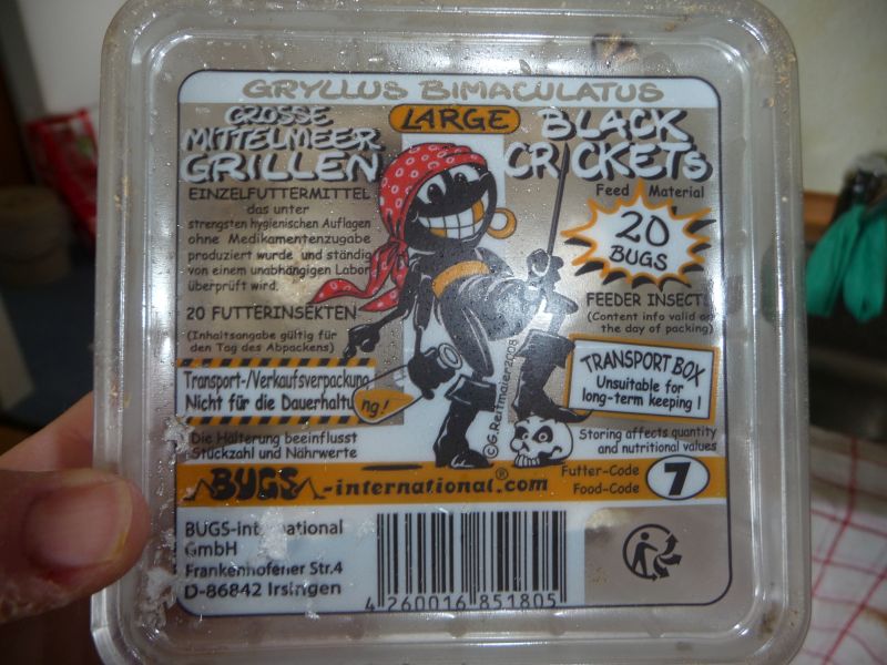 But the pet store only had fruit flies, meal worms, some GIANT locusts and the crickets. Everything else was not in stock. So I took the crickets.