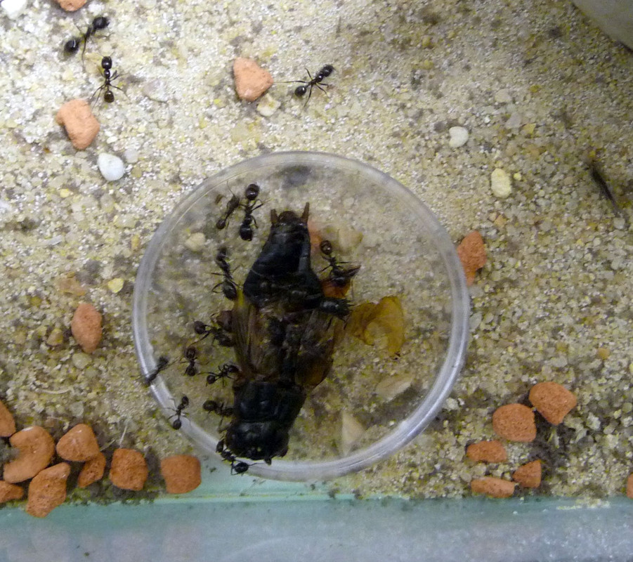 OMG the Pogonomyrmex occidentalis went nuts for it. I have not seen such a response to any other bug, and less than 24 hours later there is just one tiny bit of it left to be seen anywhere(it is in the nest they are still working on it). That's the one bug they ate 100% of, nothing meaningful seems to have gone to the trash pile.
